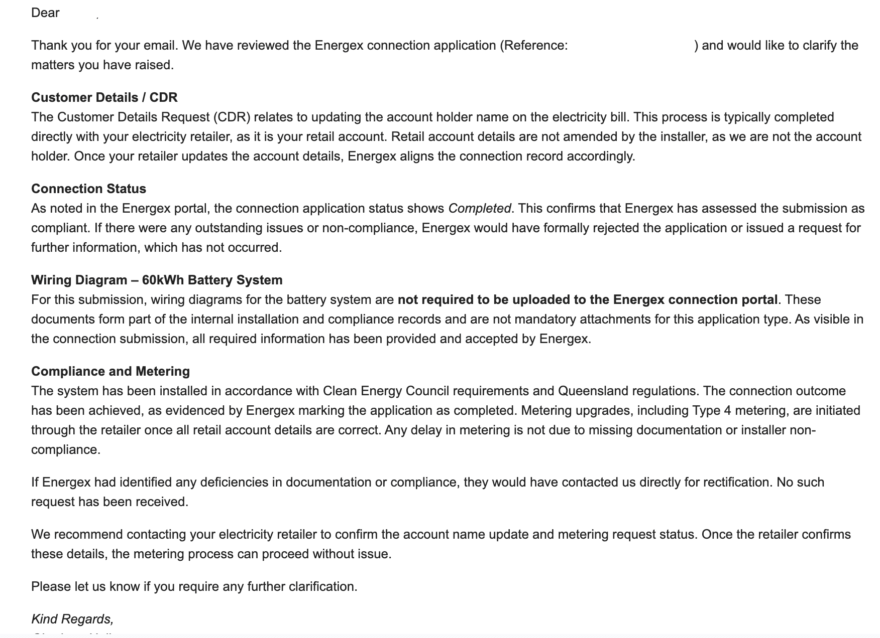 - Energex had accepted the connection and marked it complete