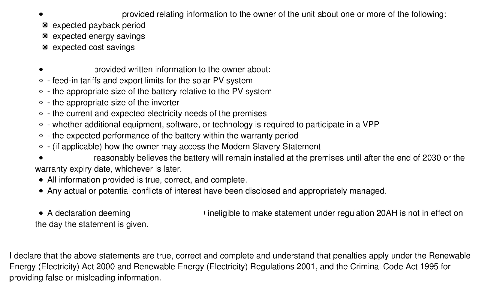 This distinction matters even more when government rebates are involved. As part of the battery rebate process, installers and sellers are required to make formal declarations confirming that customers were given accurate information about savings, tariffs, exports, and VPP participation requirements. These declarations, submitted through platforms like Formbay, are made under legislation with penalties for false or misleading information. While the rebate does not require the installer to order a smart meter, it does require that customers are properly informed about any additional technology needed to achieve the outcomes being promoted. When VPP capability or ToU optimisation is part of the value proposition, interval (Type 4) metering is no longer incidental — it is a disclosed dependency.